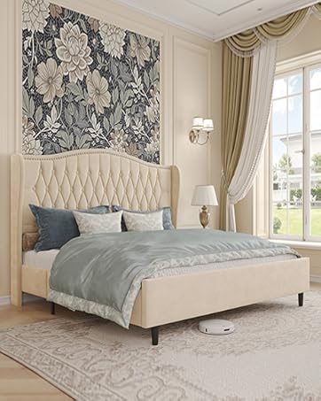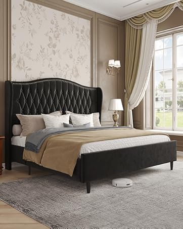 Belffin King Bed Frame and Headboard, Luxury Upholstered Velvet Platform Bed with Wingback, Button Tufted & Nailhead Trim, Anti-Slide Tall Footboard, No Box Spring Needed, Noise-Free, Black